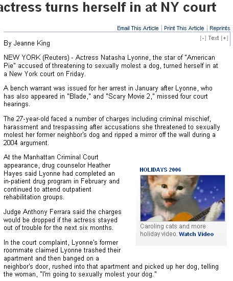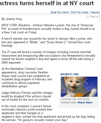 Br'er Drudge is linking to this article about an actress apparently going a bit overboard in an antithetical-to-PETA manner.